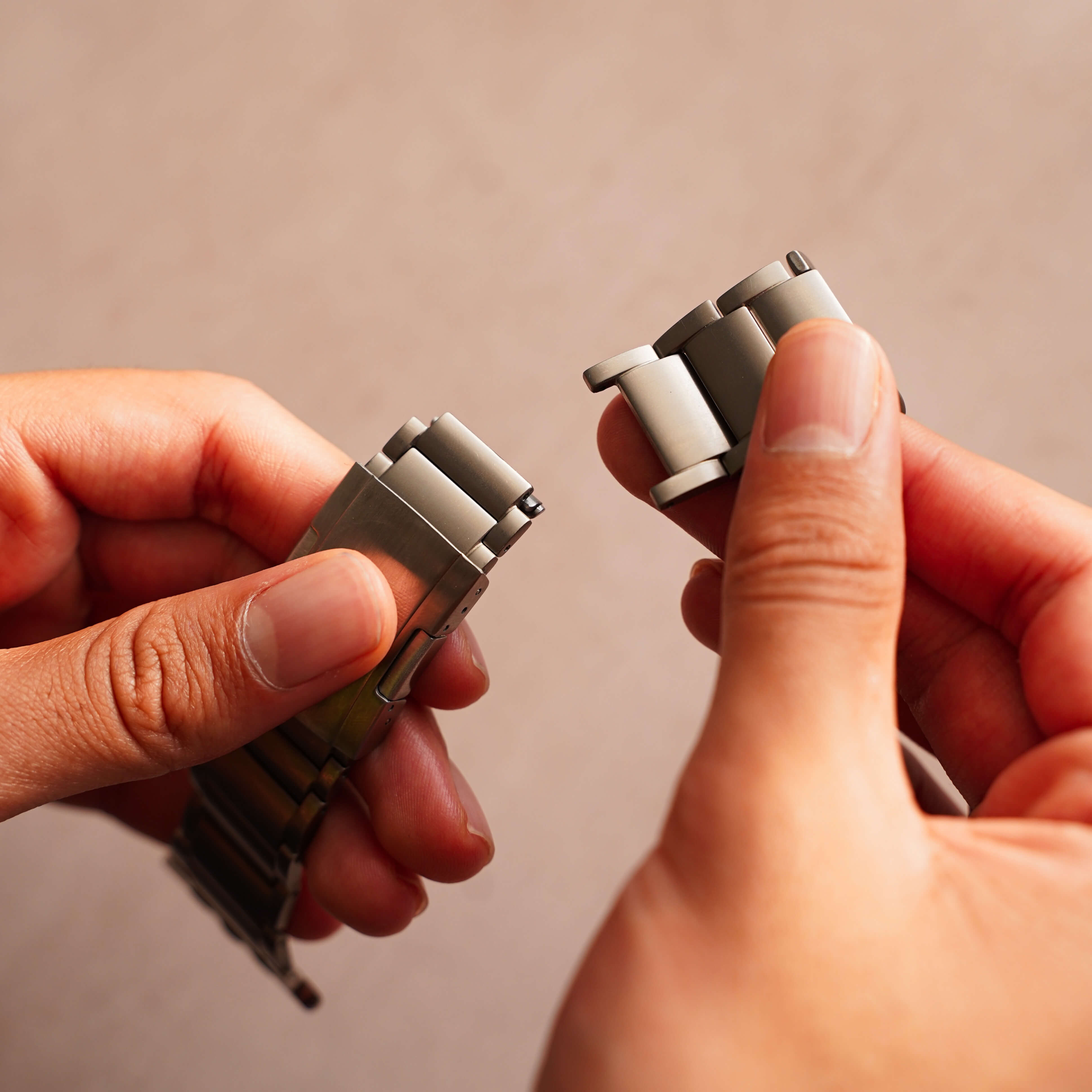 Our Titanium Strap is one-size-fits-all. That means you can easily take out unnecessary links by yourself and dial in the perfect size.