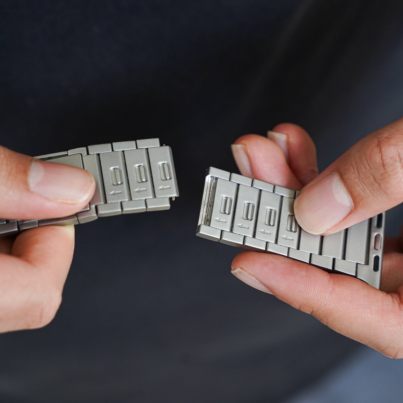 The links on the Titanium Bracelet feature easy-release buttons, allowing you to add or remove links effortlessly without the need for traditional tools.