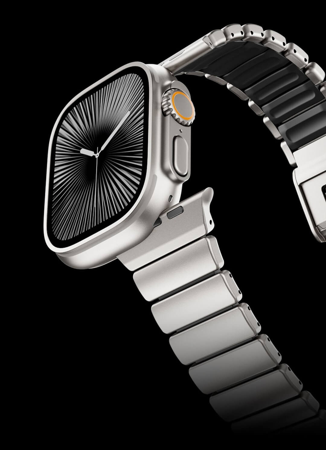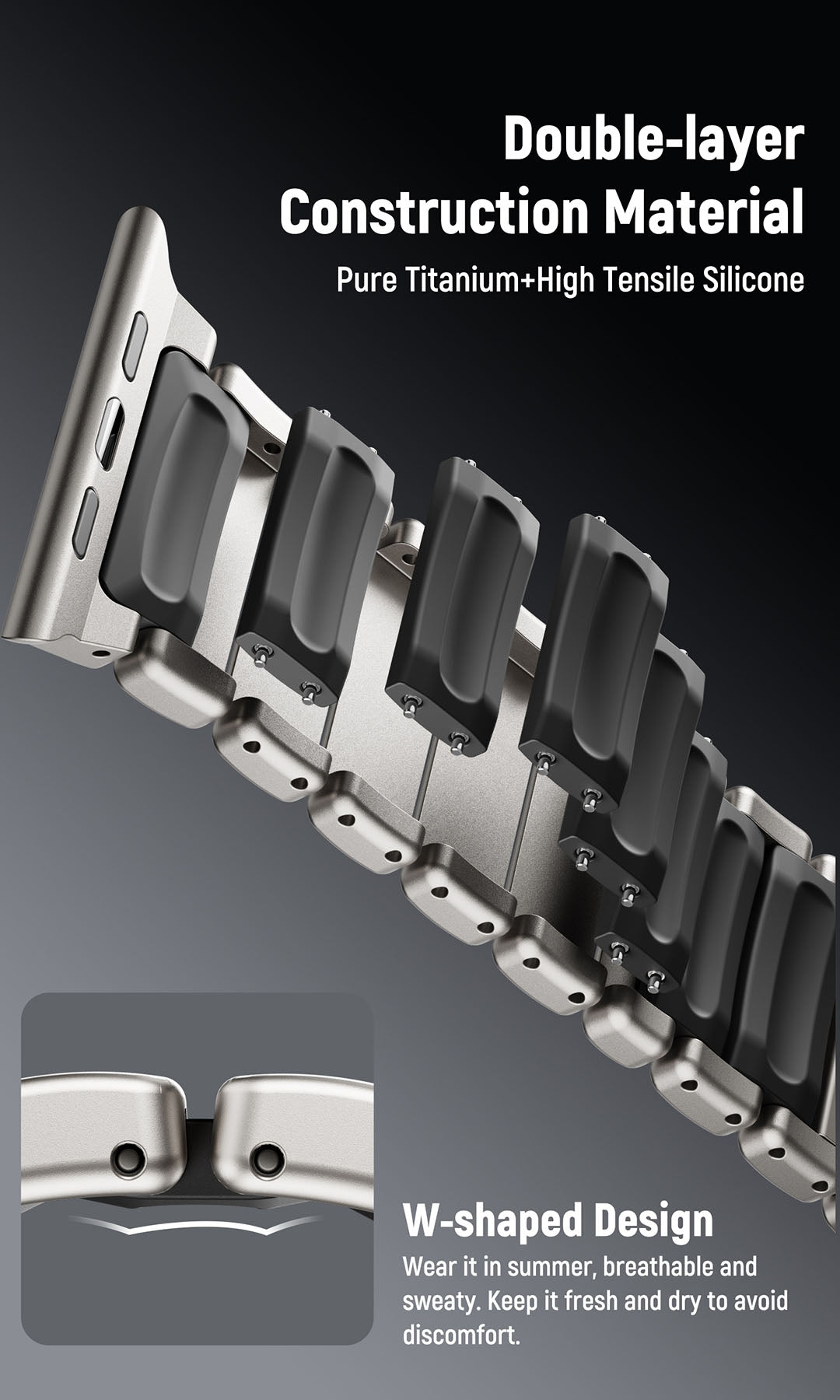 The all-in-one band that delivers premium aesthetics and athletic performance without compromise. Grade-2 Titanium links on the outside, flexible high-performance FKM silicone on the inside, creating a band that adapts to every moment of your day.
